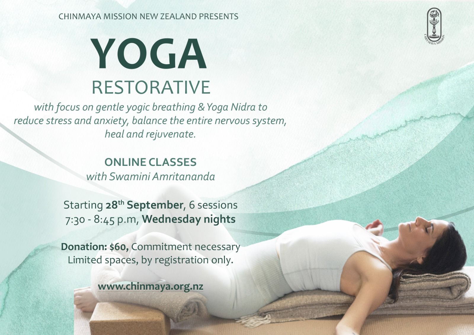 Register Now In truth yoga doesn’t take time – it gives time. Relax, Restore, Re-energize with focus on gentle yogic breathing & Yoga Nidra. This class aims to facilitate passive healing, rejuvenation and increased well-being as an antidote to stress and dis-ease Starting 10th August - Every Wednesday Night 7:30pm to 8:45pm $60 for a...